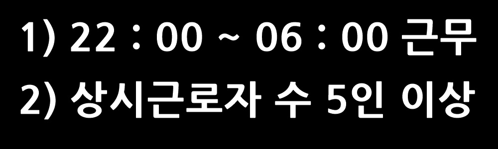 ์ฆ, 22 : 00 ~ ์ต์ผ 06 : 00 ์ ๊ทผ๋ฌดํ๊ณ , ์์ ์ฅ์ ์์๊ทผ๋ก์ ์๊ฐ 5์ธ ์ด์ ์ด์ด์ผ ์ผ๊ฐ์๋น ์ง๊ธ๊ธฐ์ค์ ์ถฉ์กฑ๋ฉ๋๋ค.