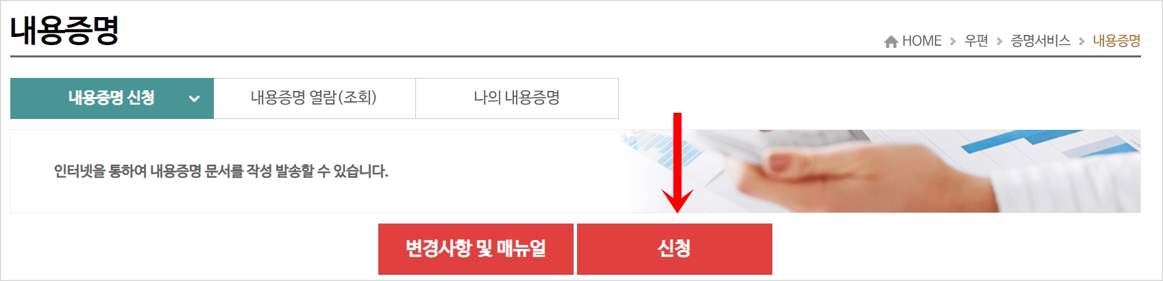 โฒ ์ธํฐ๋ท์ฐ์ฒด๊ตญ ํํ์ด์ง ๋ฉ์ธํ๋ฉด์ ๋๋ค. ์๋จ ๋ฉ๋ด [์ฐํธ]์์ [์ฆ๋ช ์๋น์ค]-[๋ด์ฉ์ฆ๋ช ]์ ํด๋ฆญํฉ๋๋ค.