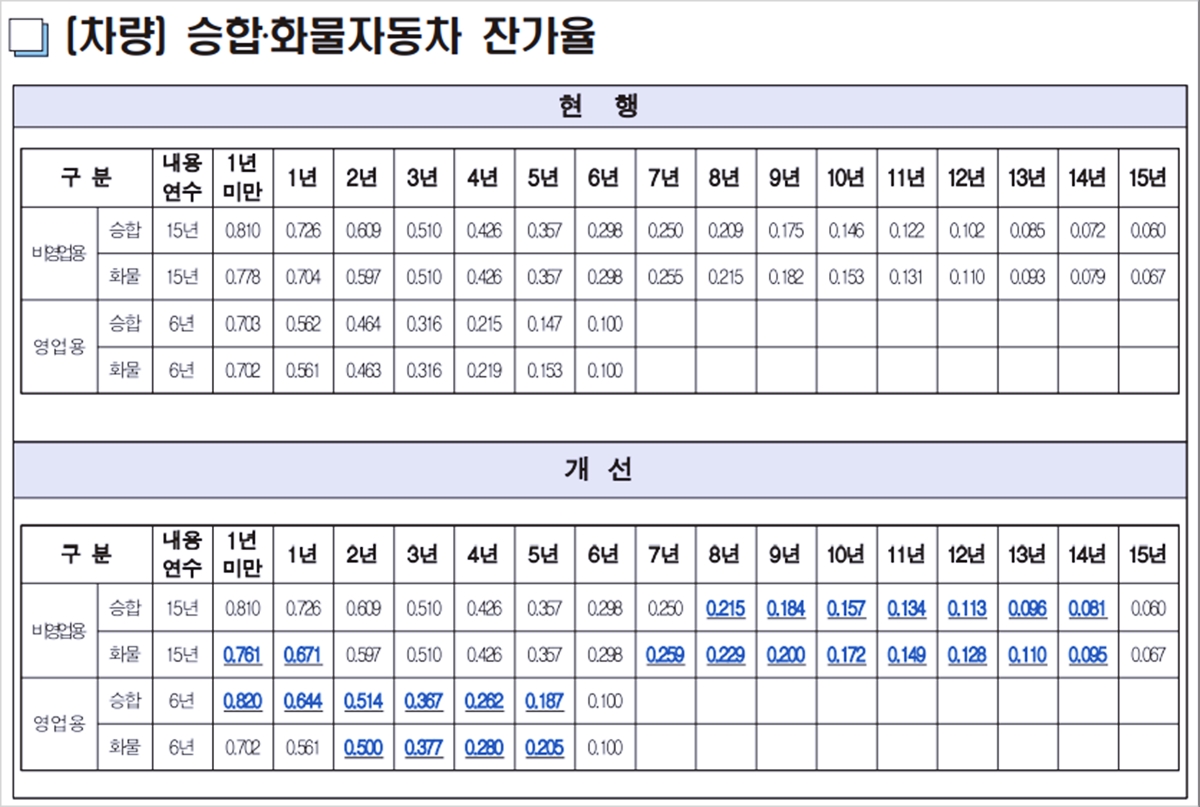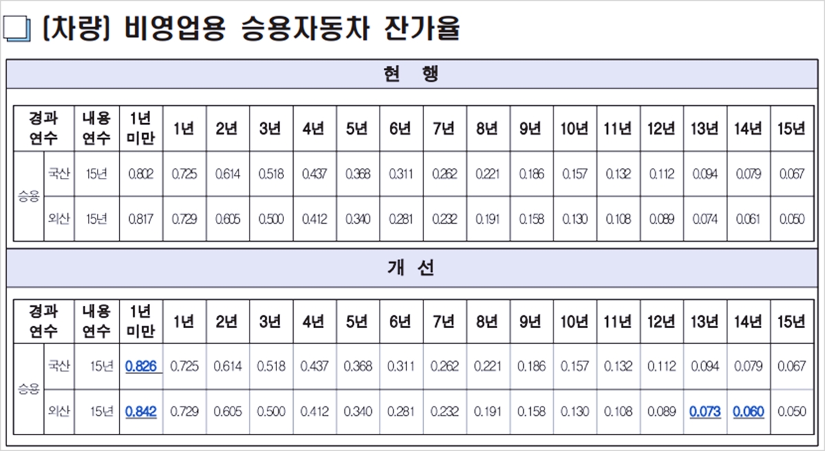 โฒ ๊ฐ ์ฐจ๋๋ณ ์๊ฐ์จ์ ํ์ธํ ์ ์์ต๋๋ค. ๋น์์ ์ฉ ์น์ฉ์๋์ฐจ์ ๊ฒฝ์ฐ 1๋ ๋ฏธ๋ง์ด๋ผ๋ฉด ์๊ฐ์จ์ 0.802๋ก ๊ณ์ฐ๋์ง๋ง 1๋ ์๋ 0.725, 2๋ ์๋ 0.614, 3๋ ์๋ 0.518๋ก ๋จ์ด์ง๋๋ค.