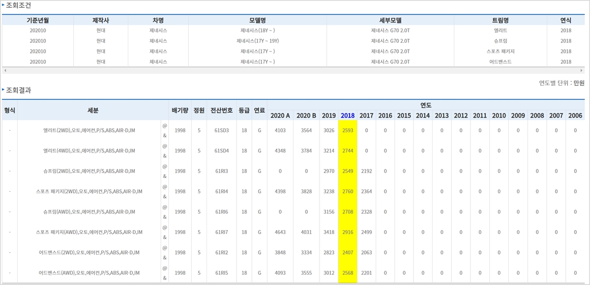 โฒ ๋งํฌ๋ฅผ ํตํด ์ด๋ํ๋ฉด ์์ฒ๋ผ ์ฐจ๋ ๊ธฐ์ค๊ฐ์ก์ ์กฐํํด๋ณผ ์ ์๋๋ก ๊ธฐ์ค๋ ์, ์ ์์ฌ, ์ฐจ์ข , ์ฐจ๋ช ๋๋ถ๋ฅ, ์ฐจ๋์ฐ์ ๋ฑ์ ์ ํํด์ฃผ์๋ฉด ๋ฉ๋๋ค. ์ ๋ 2020๋ 10์ ๊ธฐ์ค์ผ๋ก ํ๋ ์๊ฐ์ฉ ์น์ฉ์ฐจ๋ก ์ฐ์ 2018๋ ์ ๋ค์์ค G70.2.0T์ ์ฐจ๋ ๊ธฐ์ค๊ฐ์ก ์กฐํ๋ฅผ ํด๋ณด์์ต๋๋ค.