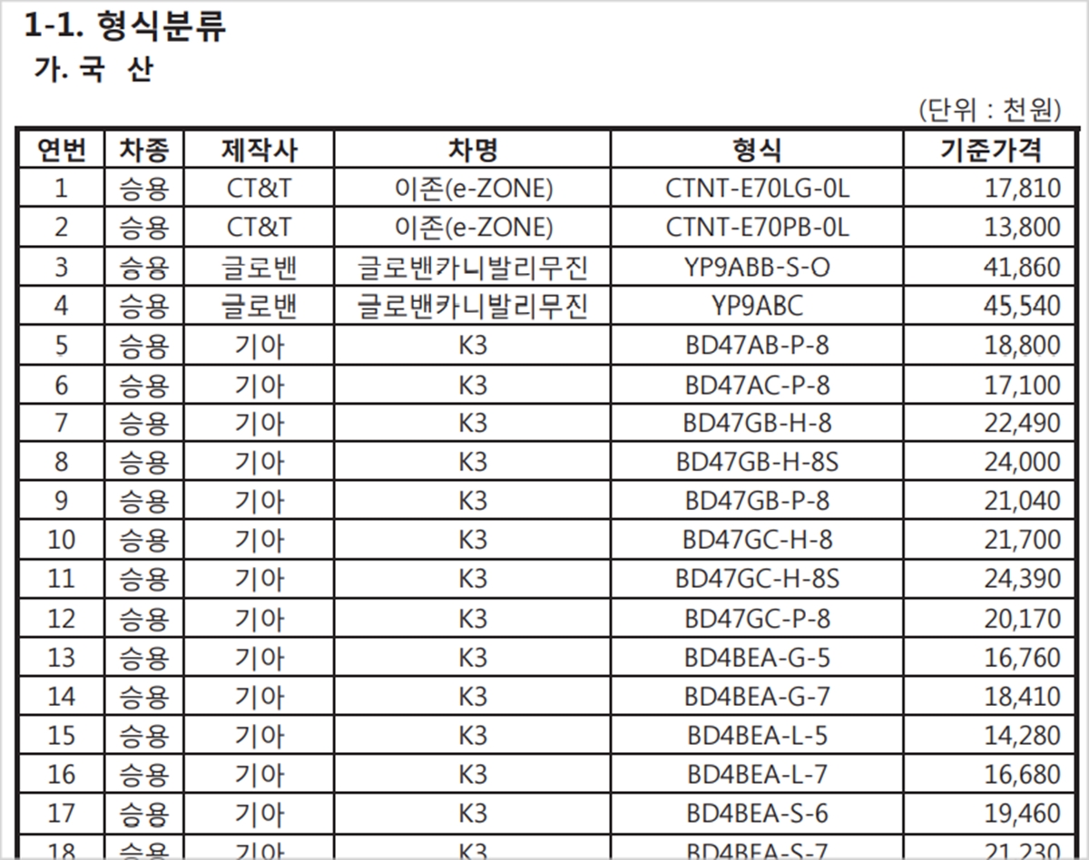 โฒ ์์ฒ๋ผ ๊ฐ ์ต์ ์ ๋ฐ๋ผ ์ฐจ๋ ๊ธฐ์ค๊ฐ์ก์ ํ๋์ ์ฝ๊ฒ ํ์ธํ ์ ์์ต๋๋ค.