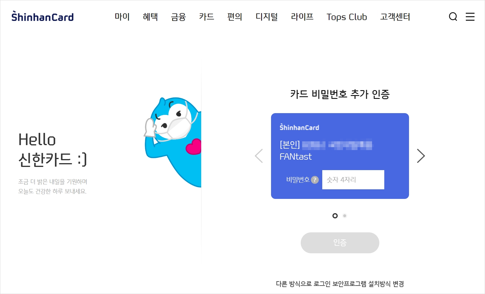 4. ์นด๋ ๋น๋ฐ๋ฒํธ๋ฅผ ์ ๋ ฅ ํ ์ธ์ฆ์ ํด๋ฆญํฉ๋๋ค.