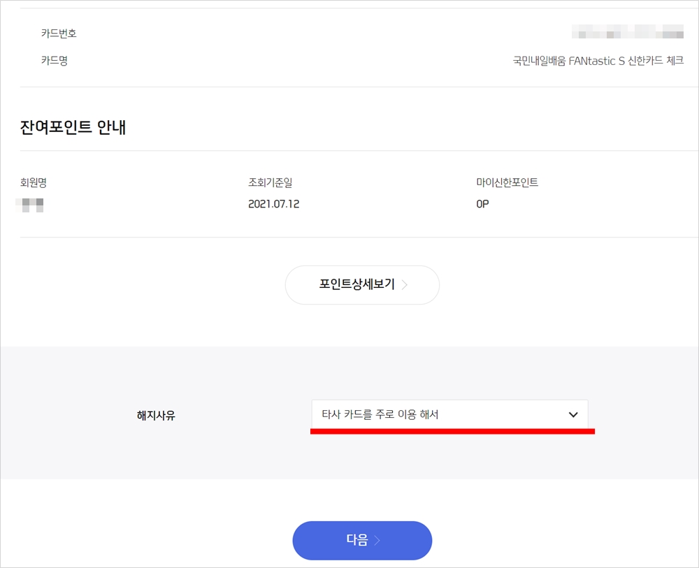 7. ์นด๋ ์ ๋ณด์ ์์ฌ ํฌ์ธํธ๋ฅผ ํ์ธํ์๊ณ ํด์ง์ฌ์ ๋ฅผ ์ ํํ ํ ๋ค์์ ํด๋ฆญํฉ๋๋ค.