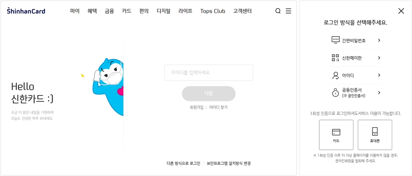3. ์ ํ์นด๋ ์์ด๋๋ก ๋ก๊ทธ์ธํฉ๋๋ค. ์์ด๋๋ฅผ ๋ชจ๋ฅด์๊ฒ ๋ค๋ฉด '๋ค๋ฅธ ๋ฐฉ์์ผ๋ก ๋ก๊ทธ์ธ'์ ์ด์ฉํด ๊ณต๋ ์ธ์ฆ์, ํด๋ํฐ ๋ฑ์ ์ด์ฉํด ๋ก๊ทธ์ธํฉ๋๋ค.