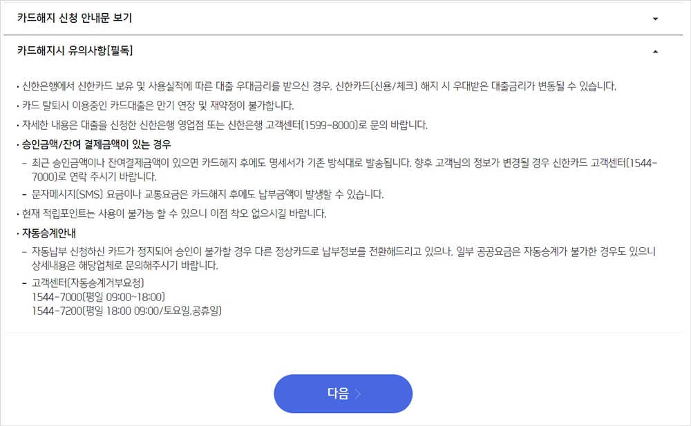 5. ์นด๋ ํด์ง ์ ์ ์์ฌํญ์ ์ดํด๋ณด๊ณ ๋ฌธ์ ๊ฐ ์์ ์ ๋ค์์ ํด๋ฆญํฉ๋๋ค.