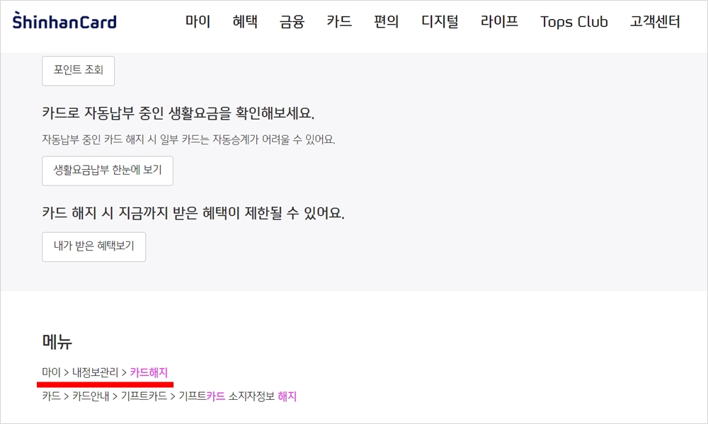 2. ๋ฉ๋ด์ ์๋ ๋ง์ด> ๋ด ์ ๋ณด ๊ด๋ฆฌ> ์นด๋ ํด์ง๋ฅผ ํด๋ฆญํฉ๋๋ค.