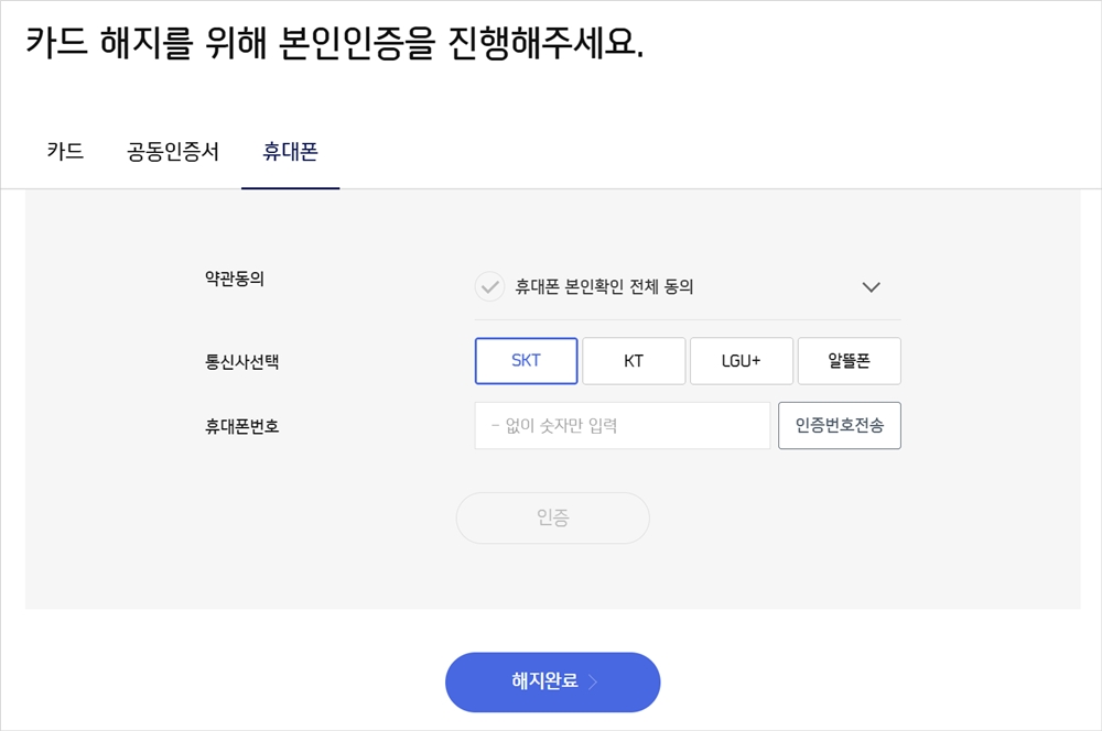 8. ์นด๋, ๊ณต๋ ์ธ์ฆ์, ํด๋ํฐ ๋ฑ์ ์ด์ฉํด ๋ณธ์ธ์ธ์ฆ์ ํ์ ํ ํด์ง ์๋ฃ๋ฅผ ํด๋ฆญํ์๋ฉด ์ ํ์นด๋๊ฐ ์ ์์ ์ผ๋ก ํด์ง๋ฉ๋๋ค.